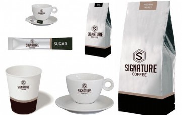 Het bijbehorende assortiment melkcups, suikersticks, koekjes, servies en bekers wordt tevens veelal geleverd in de luxe uitstraling van Signature Coffee.